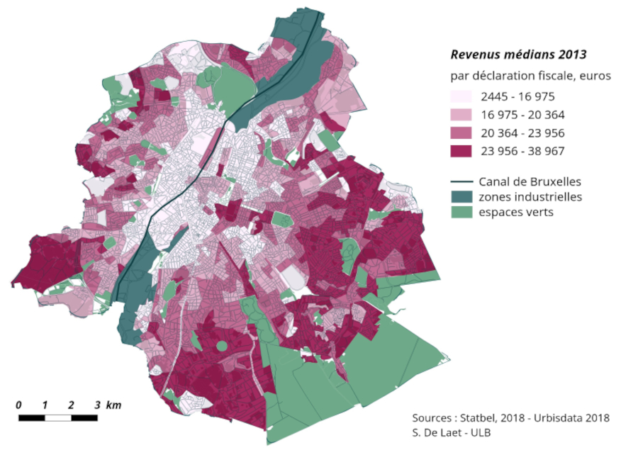 Comme le montre la carte des revenus à Bruxelles (ci-dessus), et malgré toutes les évolutions évoquées, cette structuration socio-spatiale de part et d’autre du canal est stable dans le temps. Cependant, de nouvelles dynamiques viennent petit à petit rebattre les cartes et posent de nombreuses questions.