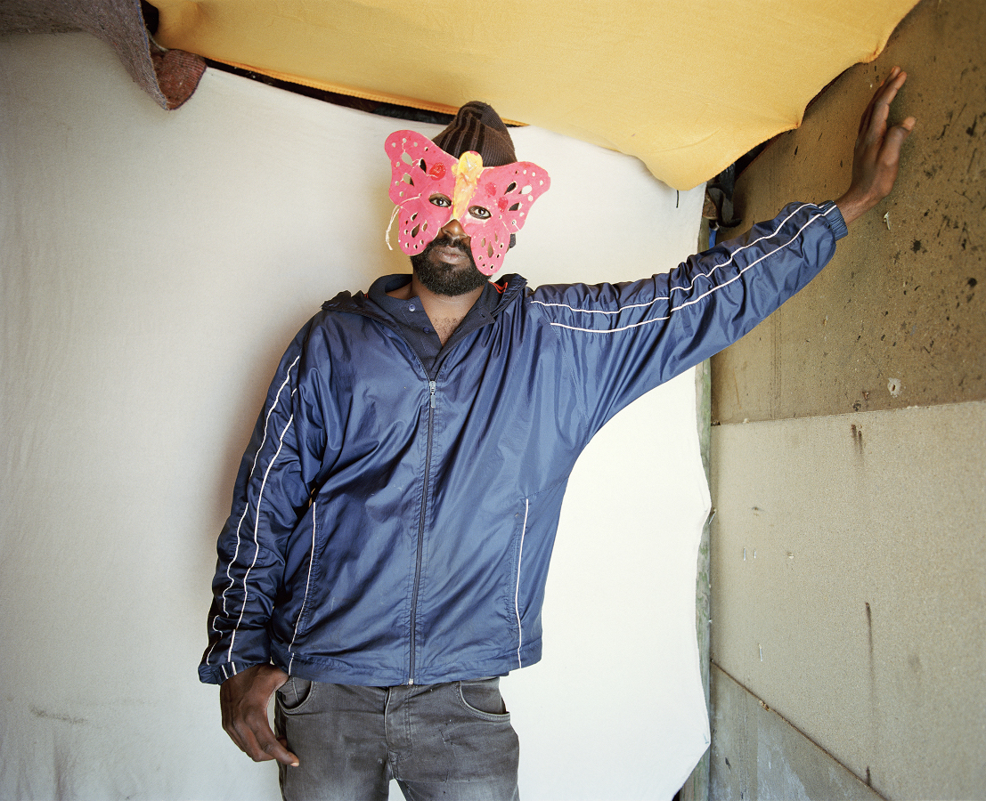 Image : ©Élisa Larvego, Ibrahim dans sa cabane en construction, zone nord de la Jungle de Calais. Série Chemin des Dunes, 2016