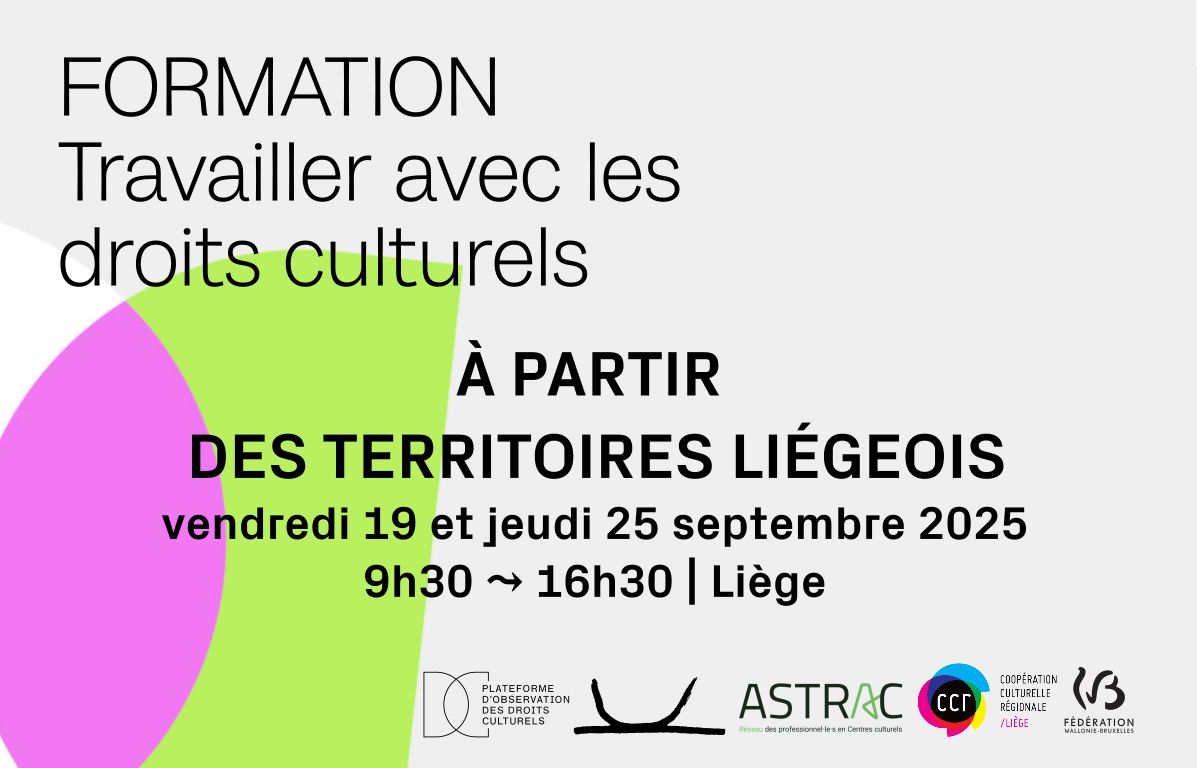 Un module de formation « à partir des territoires liégeois » aura lieu le vendredi 19 et jeudi 25 septembre 2025 de 9h30 à 16h30 à Angleur/Liège (précisions à venir – gare d’Angleur à proximité) et en collaboration avec la Coopération culturelle régionale CCR/Liège et l’ASTRAC.
